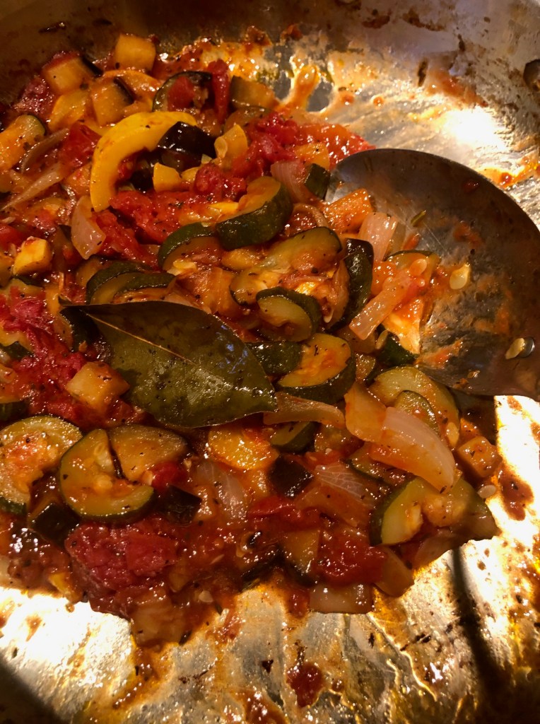 In our last post, we sautéd the sliced squash. Now it’s time to finish the ratatouille.